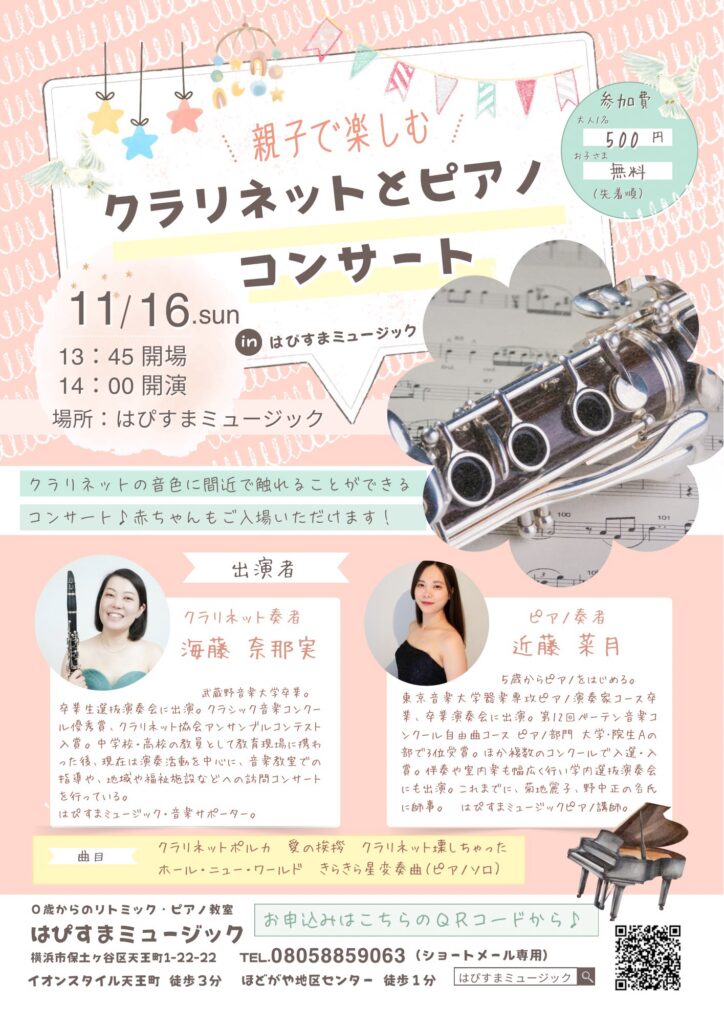 天王町・星川のピアノ教室 クラリネットとピアノのコンサート開催のお知らせ