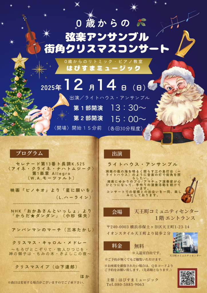 12月14日(日)に横浜市保土ヶ谷区にある天王町コミュニティセンターで、街角クリスマスコンサートを開催します!